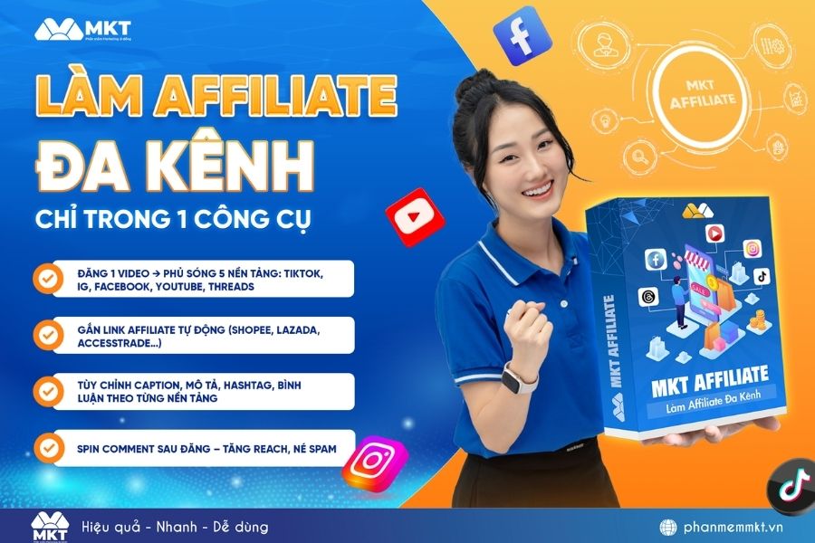 Phần mềm MKT Affiliate là giải pháp toàn diện để xây dựng và vận hành hệ thống tiếp thị liên kết (Affiliate Marketing) đa kênh một cách tự động. Phần mềm này tự động hóa toàn bộ quy trình từ việc tạo nội dung, đăng tải cho đến quản lý chiến dịch affiliate trên 5 nền tảng phổ biến nhất hiện nay: TikTok, Instagram, Facebook, YouTube và Threads.