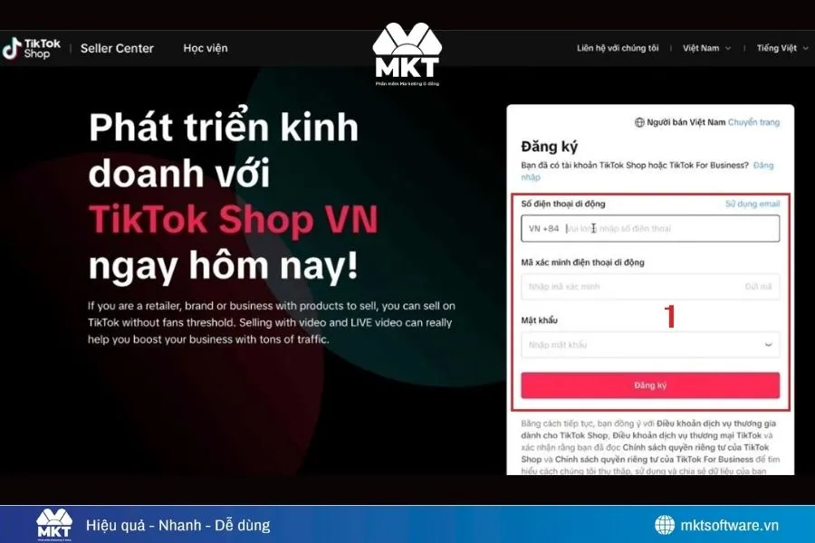 Vào websitehttps://seller-vn.tiktok.com và đăng ký bằng số điện thoại để nhận mã xác minh, hoặc liên kết trực tiếp với tài khoản TikTok đang sử dụng.