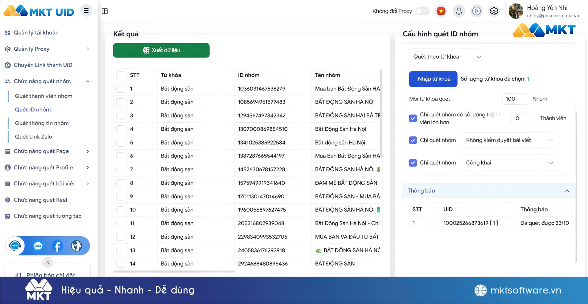 MKT UID là công cụ chuyên sâu giúp thu thập data khách hàng từ nền tảng Facebook – kênh phổ biến nhất trong lĩnh vực bất động sản. Phần mềm quét UID từ group, fanpage, profile cá nhân hoặc danh sách tương tác bài viết. Từ đó, giúp môi giới nhanh chóng tiếp cận đúng tệp khách hàng có nhu cầu mua bán bđs.