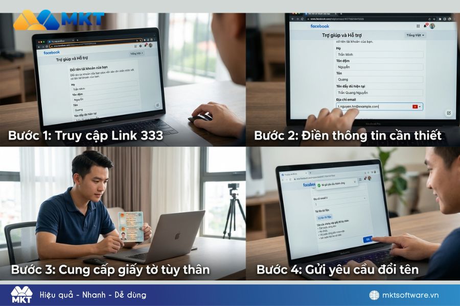 Để thực hiện đổi tên thông qua link 333, người dùng cần thao tác trực tiếp trên hệ thống hỗ trợ của Facebook theo đúng quy trình. Dưới đây là 5 bước thực hiện đơn giản và đầy đủ nhất.