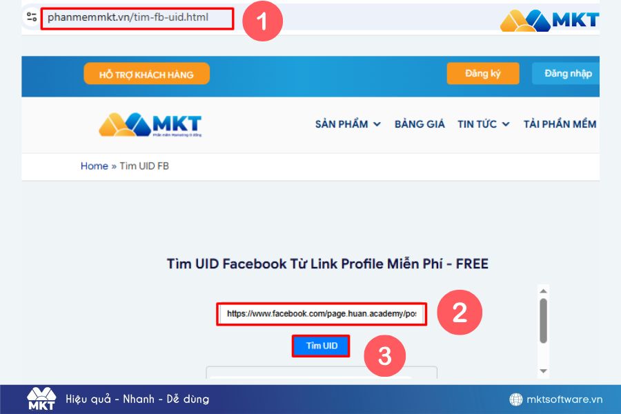 Sao chép URL cần chuyển đổi UIDBước 2: Truy cập mục “Tìm UID FB” trên website mktsoftware.vn → dán link vào hệ thống.