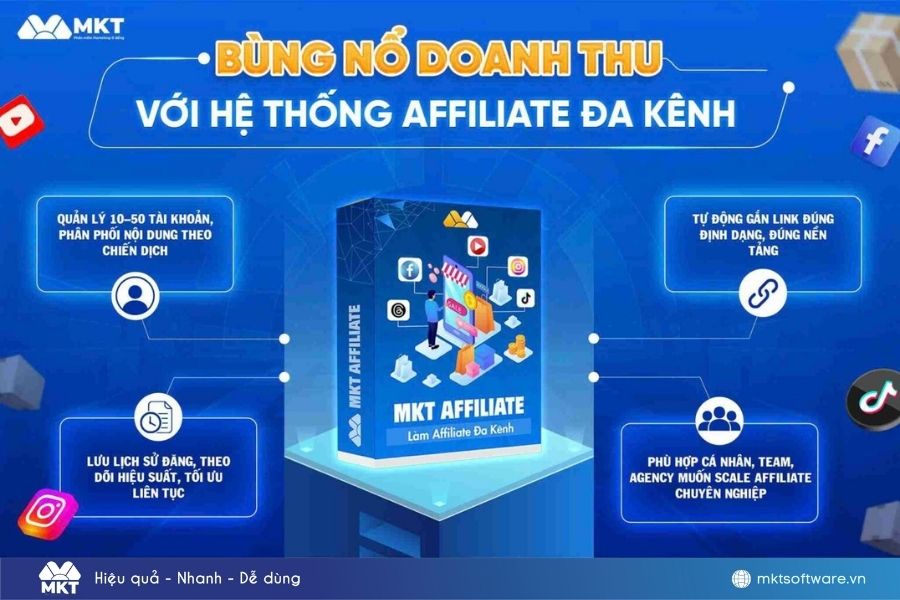 MKT Affiliate - Phần mềm chuyên biệt hỗ trợ đăng video affiliate hàng loạt lên TikTok và tự động bình luận gắn link affiliate, giúp người làm tiếp thị liên kết mở rộng quy mô nhanh chóng mà vẫn kiểm soát tốt rủi ro spam.