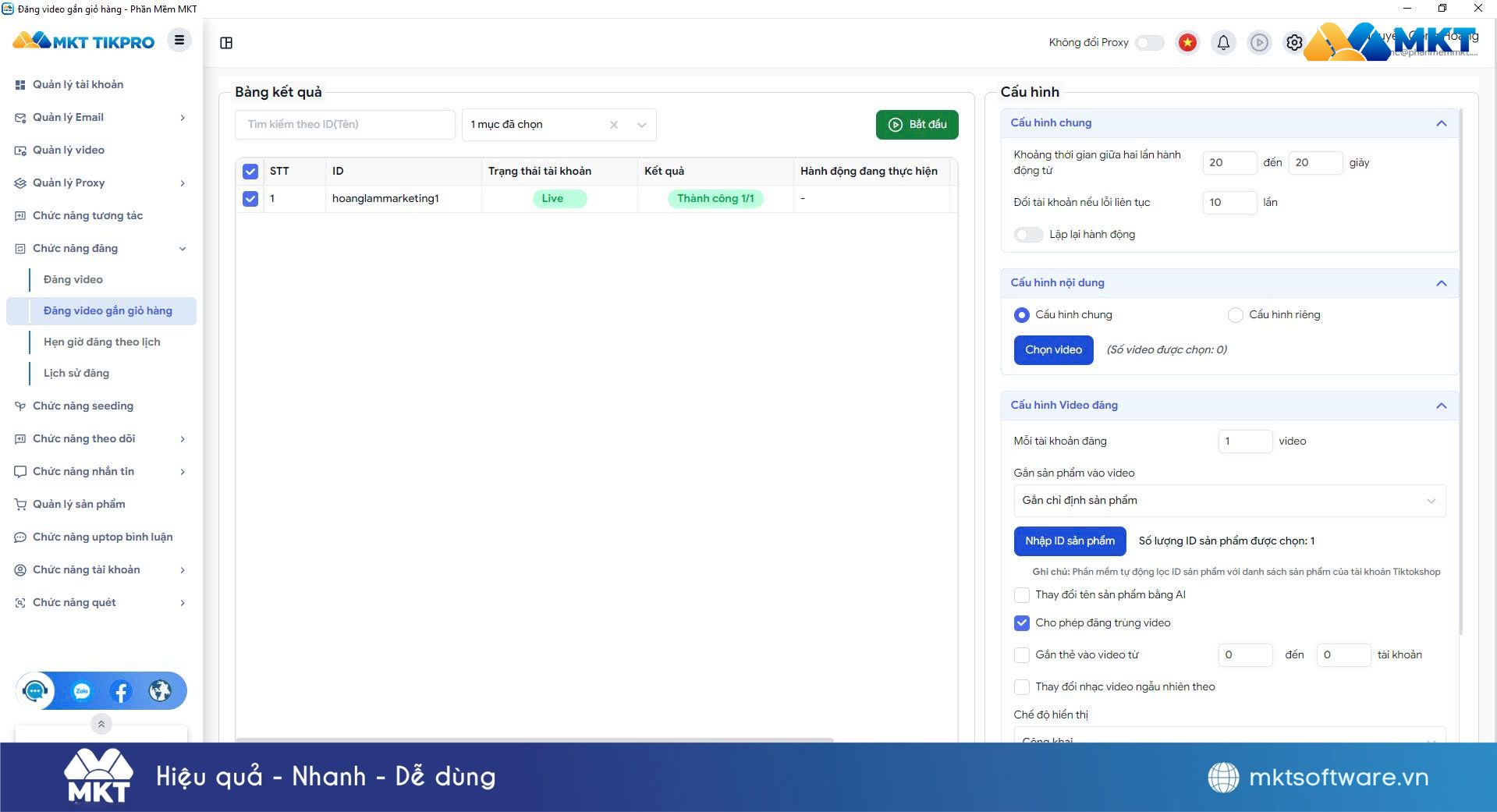 • Bước 4: Khởi chạy để phần mềm tự động đăng video kèm giỏ hàng theo cấu hình.