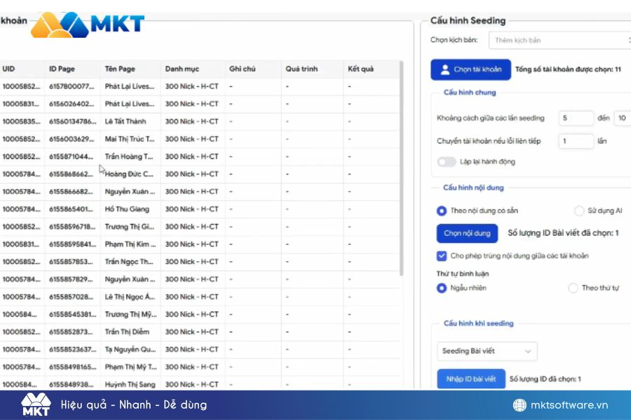 Cấu hình seeding Fanpage trên phần mềm MKT PageXem chi tiết video hướng dẫn 6 bước cài đặt tính năng seeding tự động trên phần mềm MKT Page tại đây: