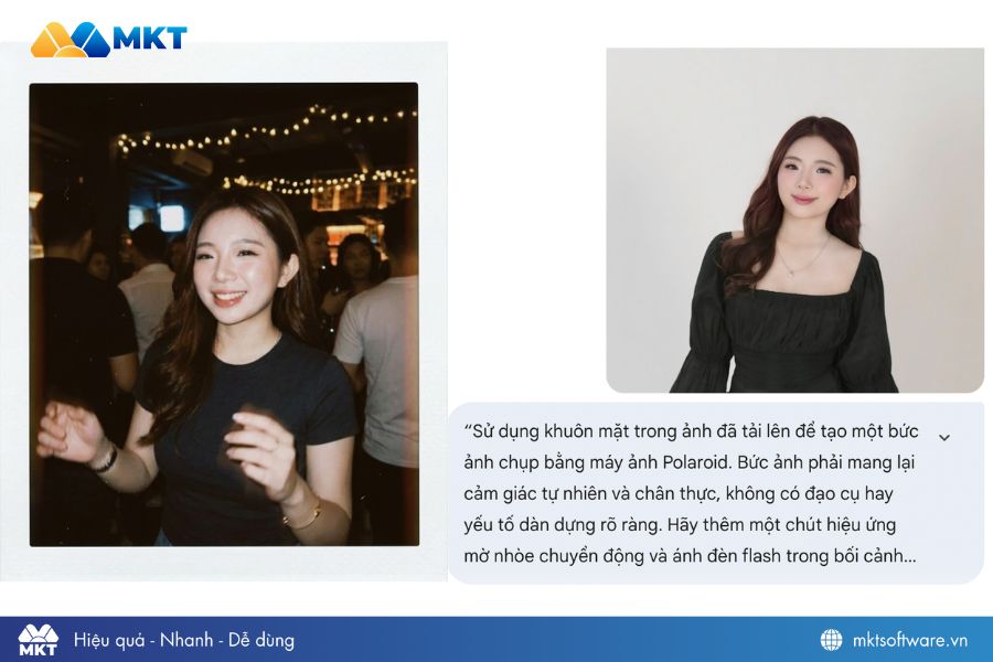 “Sử dụng khuôn mặt trong ảnh đã tải lên để tạo một bức ảnh chụp bằng máy ảnh Polaroid. Bức ảnh phải mang lại cảm giác tự nhiên và chân thực, không có đạo cụ hay yếu tố dàn dựng rõ ràng. Hãy thêm một chút hiệu ứng mờ nhòe chuyển động và ánh đèn flash trong bối cảnh tối, với ánh sáng lan tỏa nhẹ nhàng, làm nổi bật các chi tiết của ảnh.
