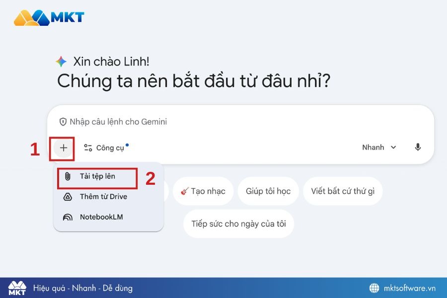 Sau đó, chọn biểu tượng dấu cộng (+) --> Chọn Tải ảnh lên để thêm ảnh chủ thể của bạn. Bạn cũng có thể thực hiện bước này bằng cách sao chép tấm ảnh và dán vào Gemini.