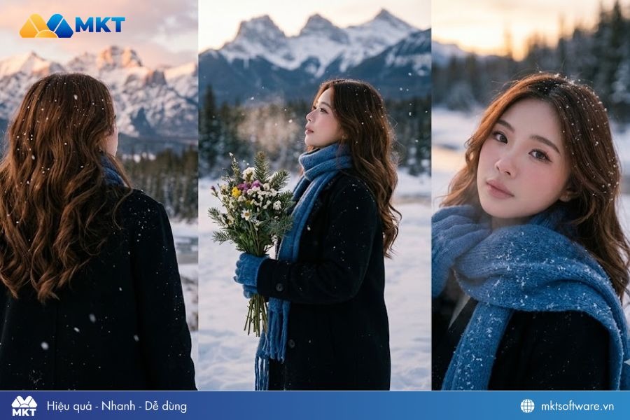 “Chụp cận chân dung trong không gian tuyết rơi, nhân vật đeo khăn xanh. Dựa trên ảnh gương mặt đã tải lên, tạo bộ ảnh ba khung hình điện ảnh, mô phỏng một người trẻ đứng giữa bối cảnh núi tuyết vào lúc hoàng hôn, với chi tiết siêu thực.