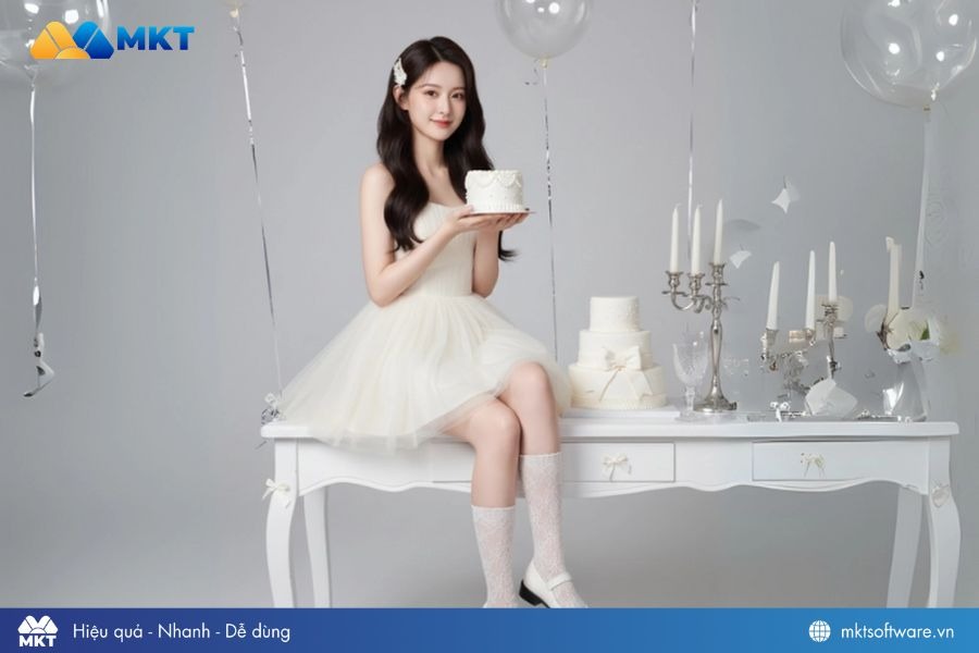 "Tạo bức ảnh chân dung studio trong không gian tiệc sinh nhật tinh tế. Nhân vật ngồi nhẹ nhàng trên bàn trắng được trang trí nơ ruy băng, bánh kem và bong bóng trong suốt. Cô mặc váy công chúa voan màu kem, đi tất ren trắng và giày bóng. Ánh sáng dịu nhẹ, khung cảnh trong sáng, lãng mạn.